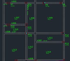 No projeto que ele está executando (forma abaixo) os pilares P12 e P25 estão com um momento fletor muito alto. Por causa disso, ambos estão com uma seção maior do que os pilares vizinhos e, mesmo assim, estão com taxas de armadura elevadas (provavelmente com mais aço nesse pavimento do que no pavimento inferior).