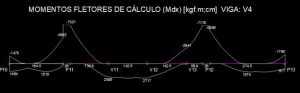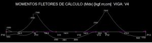 Vemos abaixo que o cortante em P13 aumentou bastante, aliviando P12. Enquanto no diagrama de momento fletor vemos que, dessa vez, surgiu momento negativo junto à P13.