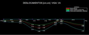Vamos ver o diagrama das flechas em V4. Reparem que no último vão à direita, o deslocamento é maior justamente em P13!!! Em situações normais, é de se esperar deslocamentos próximos de zero junto ao pilar e flechas maiores no meio do vão.